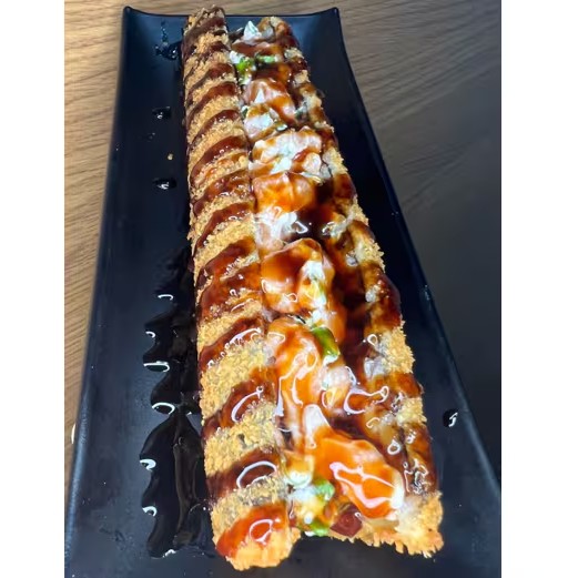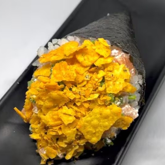 Recheado com salmão, cream cheese, cebolinha e finalizado com Doritos.