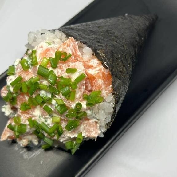 Temaki recheado com salmão batido, com cream chesse e finalizado com cebolinha. Aproximadamente 200g