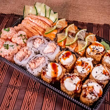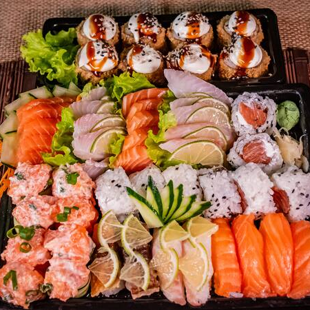 10 sashimis de salmão + 10 Tilápia, 4 niguiris de salmão + 4 de Pepino, 4 Joy de salmão + 4 de Pepino, 8 Uramaki de salmão, 8 Hot roll
