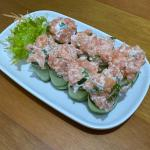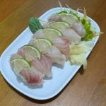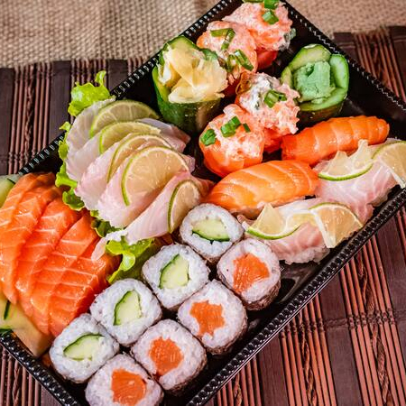 5 sashimis de salmão + 5 Tilápia, 6 uramakis skin, 2 niguiris de salmão + 2 Tilápia, 4 Joy de salmão, 4 Hossomakis de Pepino + 4 Salmão
