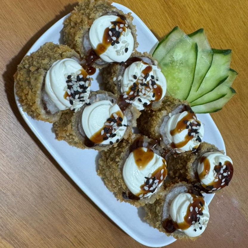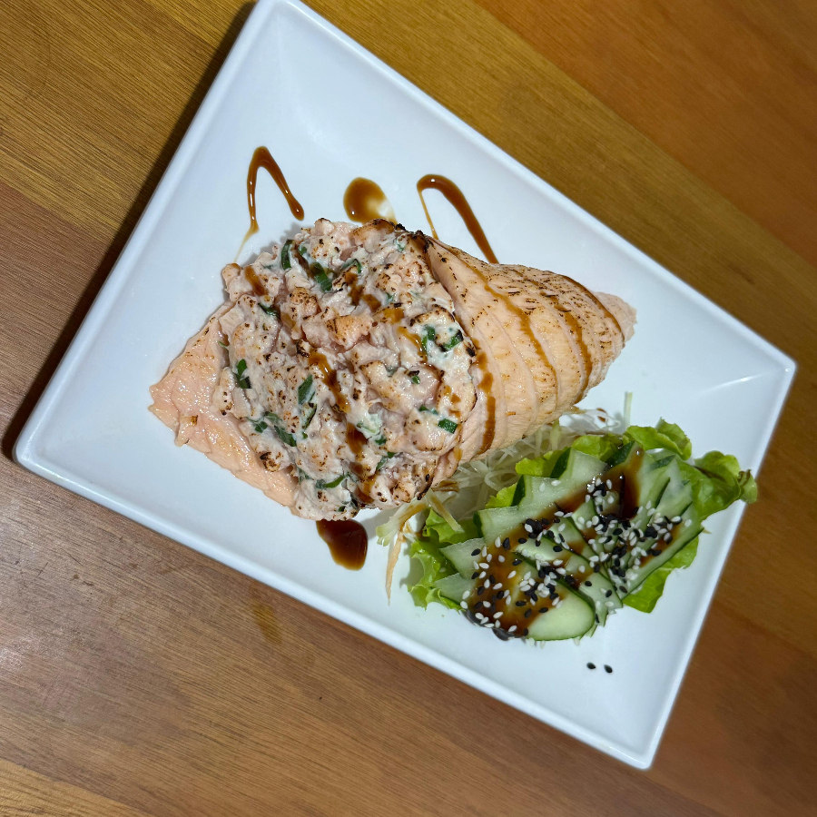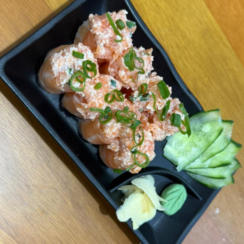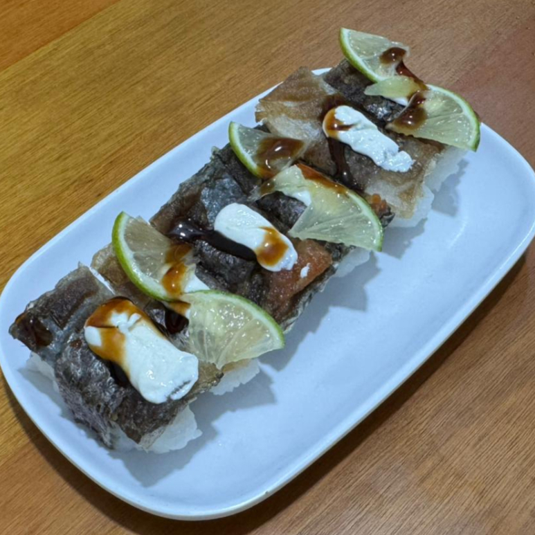5 sashimis de salmão maçaricado, 4 Joy de salmão maçaricado, 4 niguiris skin, 4 Uramaki de salmão grelhado, 8 hot rolls