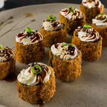 Feito com salmão cuidadosamente grelhado, realçando sua suculência e sabor inconfundível. O arroz, sempre fresquinho e no ponto certo, serve de base para a elegante cremosidade do cream cheese. A cebolinha adiciona um toque fresco e picante, enquanto o molho tarê empresta um sabor adocicado e complexo à mistura. Finalizamos com um empanado perfeitamente crocante, que garante uma textura surpreendente a cada mordida. Experimente e apaixone-se por esta obra-prima de sabor e textura!