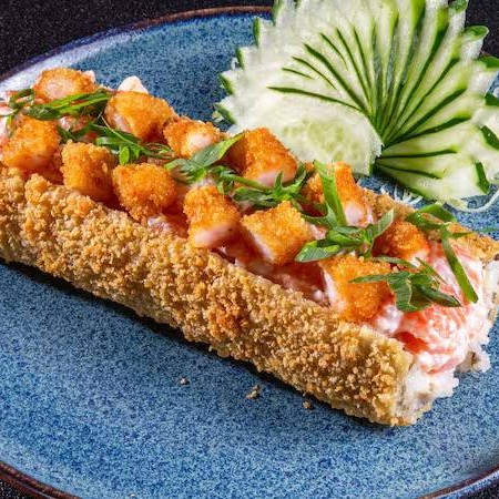 Arroz empanado e frito recheado com salmão grelhado, cream cheese e tarê.