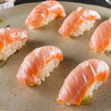 Fatia de salmão fresco por cima uma bolinha de arroz japonês, salmão maçaricado e regado com leve fio de azeite trufado e flor de sal.