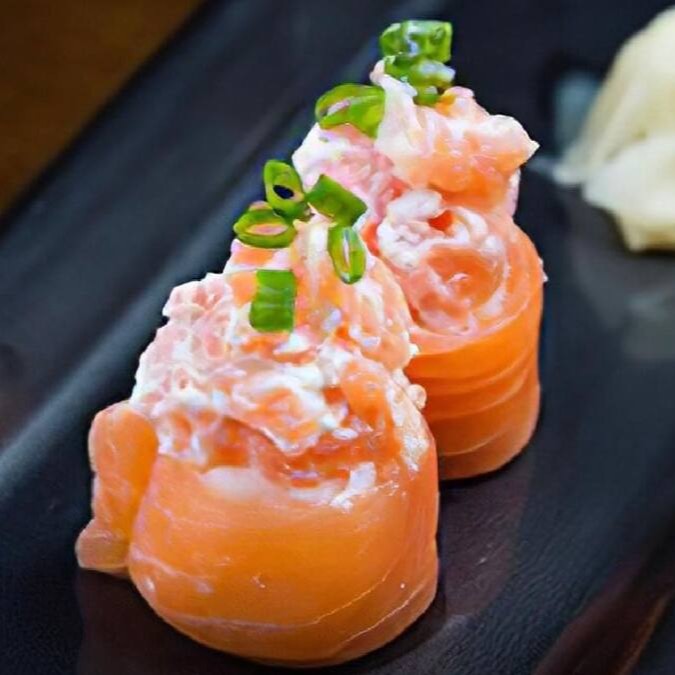 8 unidades, servido com tarê. Escolha se deseja cream cheese, couve crispy ou cebolinha.