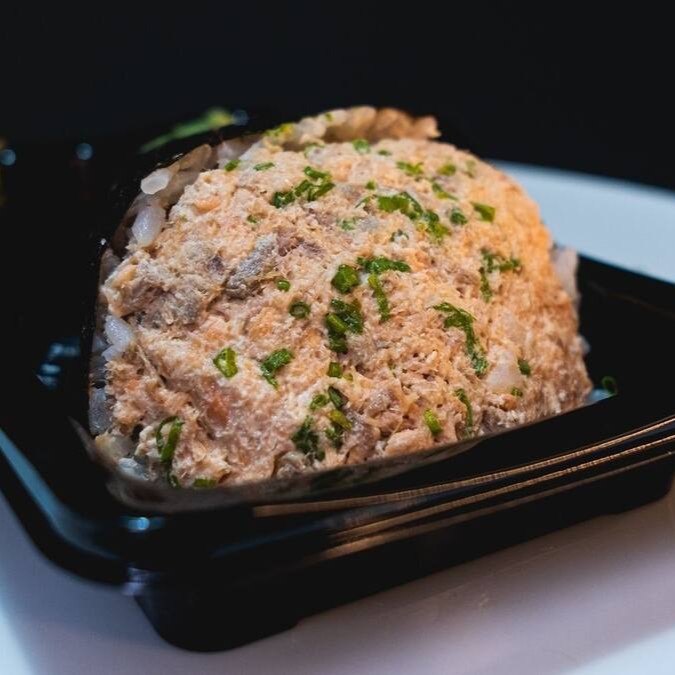 120 g de proteína/recheio, servido com geleia de pimenta, tarê, cebolinha e gergelim torrado