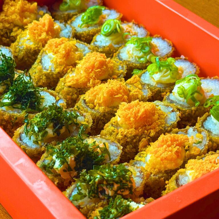 30 unidades de hot roll com até 3 crispies à sua escolha. Surpreendente!