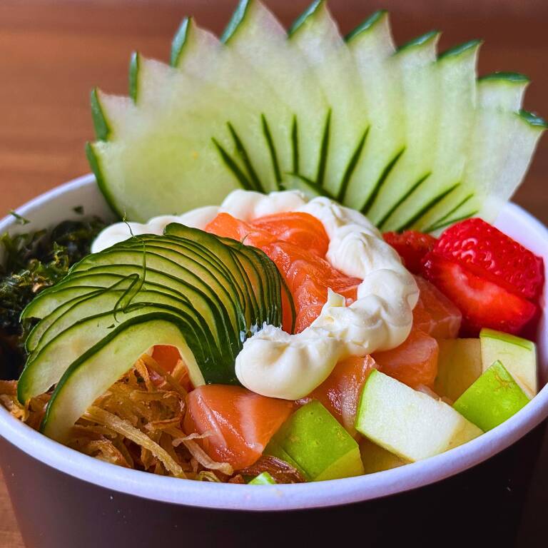 Para esta promoção, os três pokes devem ser iguais. Monte com 1 base, 2 proteínas (60 g cada), 3 acompanhamentos, 2 frutas, 2 crunches e 1 molho.