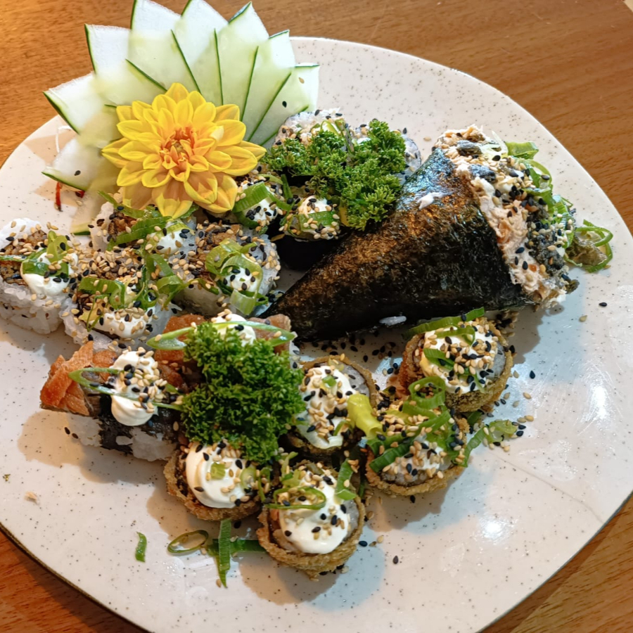 5 sashimis, 4 hossomakis, 4 uramakis, 9 hot rolls, 2 dyos, 2 niguiri, 3 rolinhos primaveras escolha entre 1 salada de pepino sunomono ou 1 shimeji