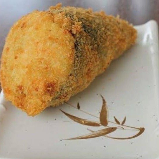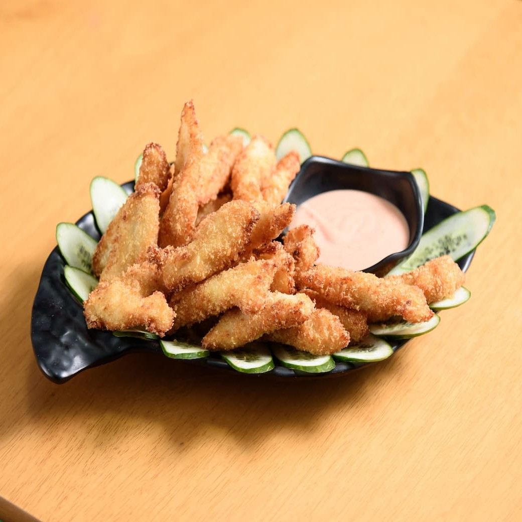 Frango empanado e frito, gergelim, cream cheese e cebolinha