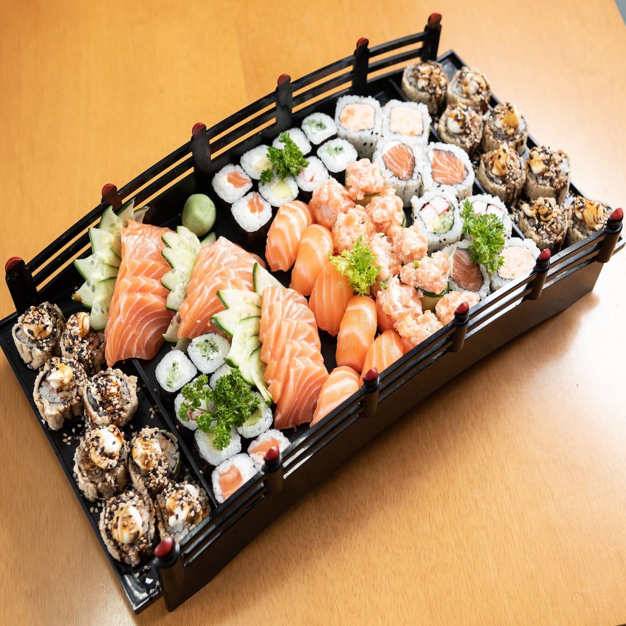 15 sashimis variados, 16 hossomakis, 8 uramakis sortidos, 18 hot rolls, 10 dyos sortidos, 6 niguiris, (serve 3 a 4 pessoas)