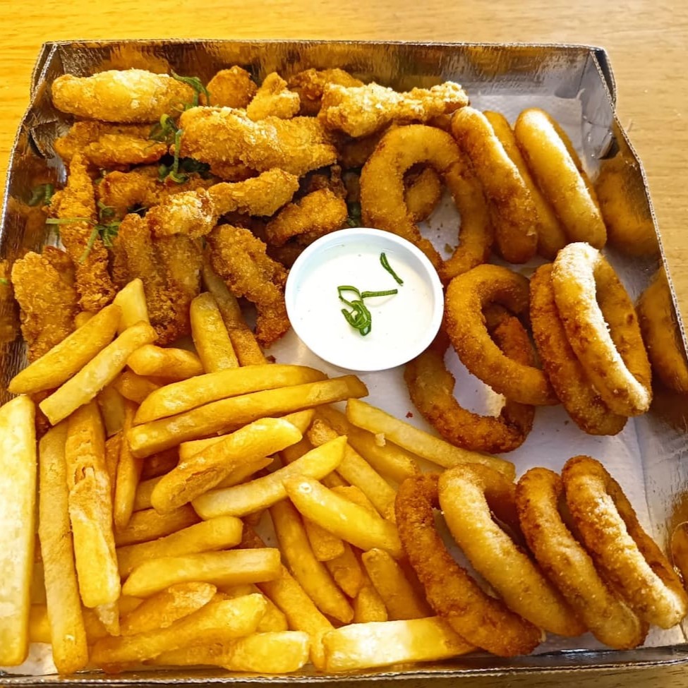 Frango frito crocante, Batata frita, Cebola empanada, Molho especial.(serve 2 pessoas)