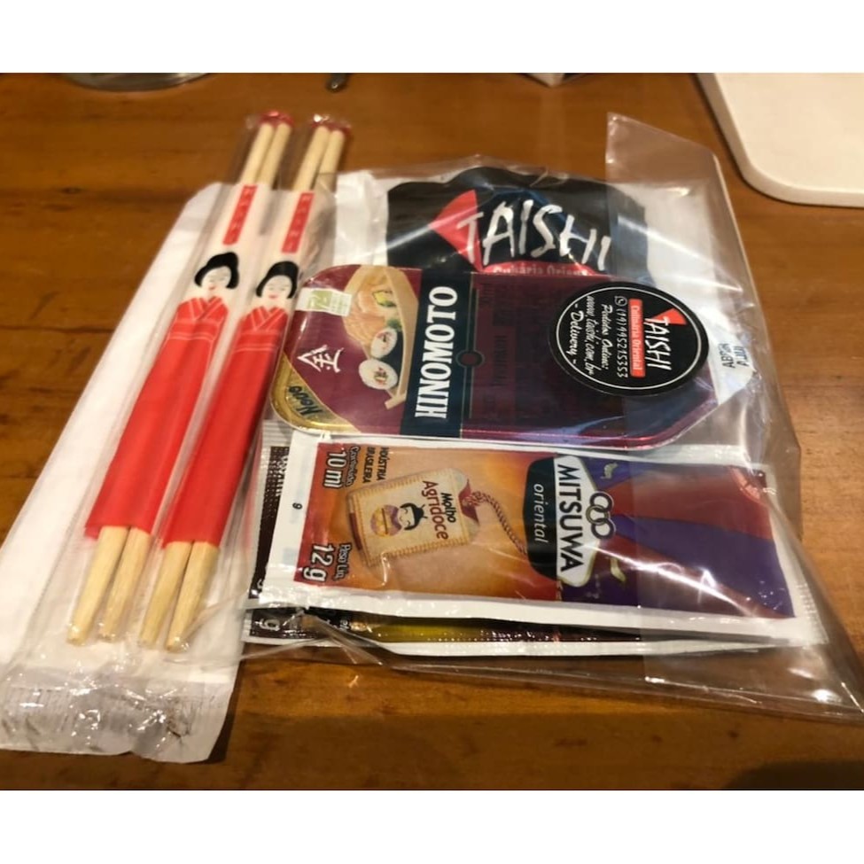 Veja O Que Já Acompanha Seu Pedido: Combinados: Hashi, shoyo, guardanapo, 1 tarê, Wasabi e Gengibre tira gosto. Combos: Hashi (exceto combinados de temakis), shoyo, guardanapo, 1 tarê pequeno Temakis: Shoyo, guardanapo Yakisobas: hashi, guardanapo Para Mais Itens Acrescentar Adicionais