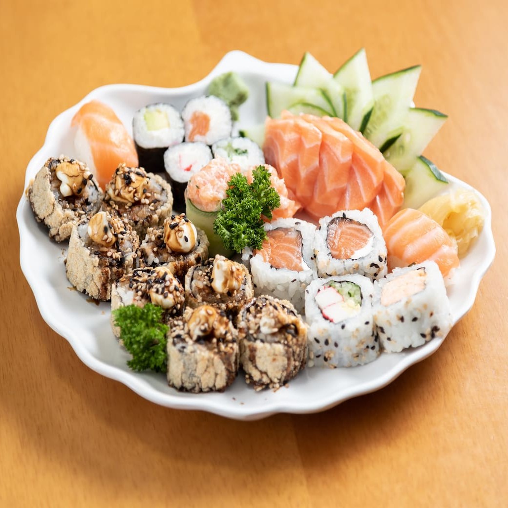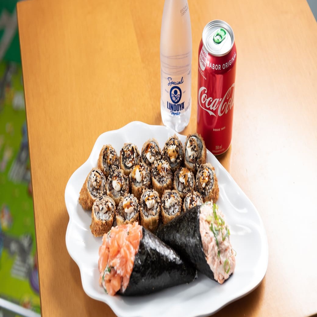 5 sashimis, 4 hossomakis, 4 uramakis, 9 hot rolls, 2 dyos, 2 niguiri, 3 rolinhos primaveras escolha entre 1 salada de pepino sunomono ou 1 shimeji