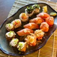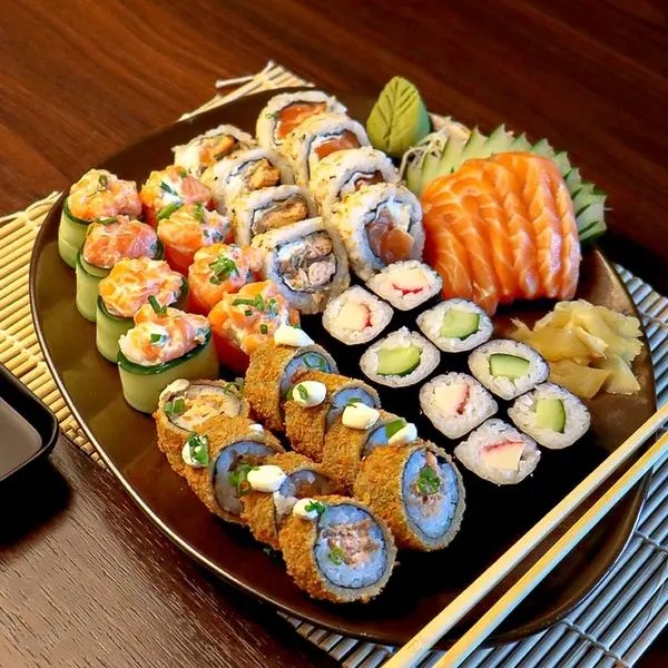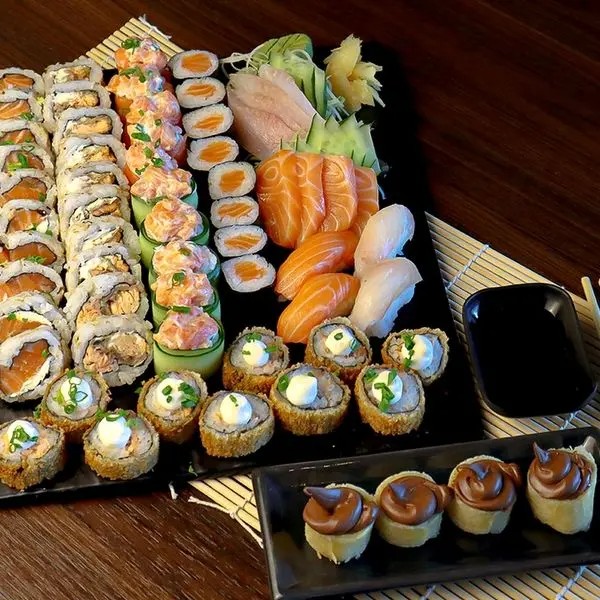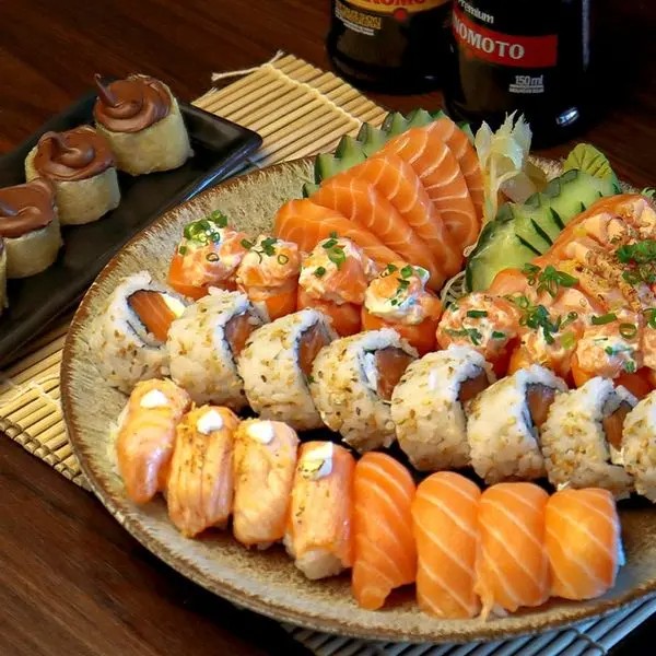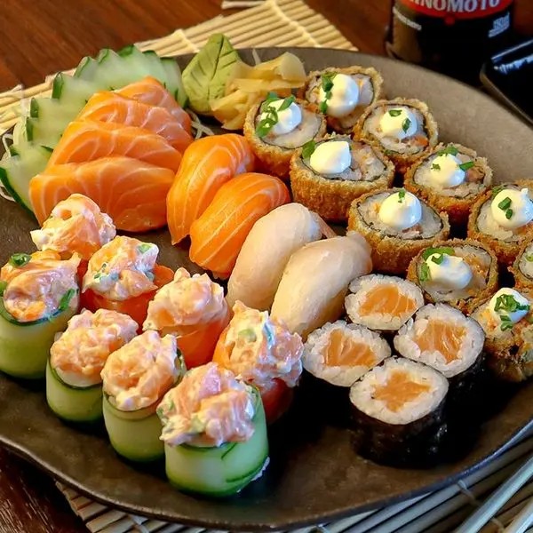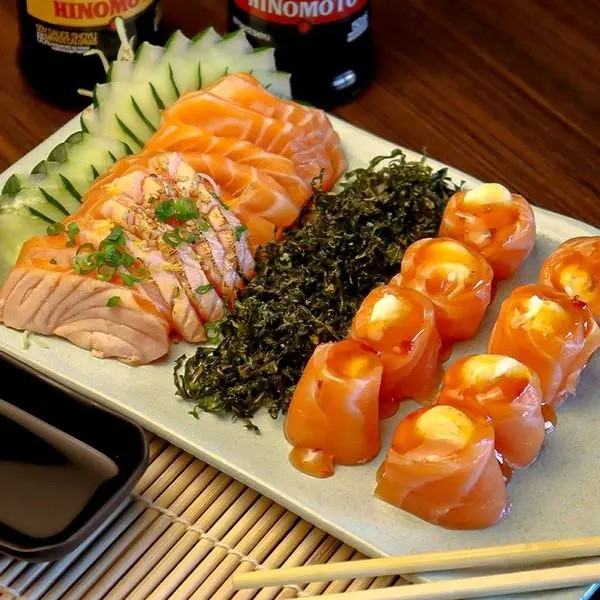 O Combinado dos Pais é um prato esplêndido, repleto de delícias do mar. Consiste em 10 fatias de sashimi de salmão, fresco e delicado, 8 enrolados de uramaki de salmão, ricamente saborosos, 8 peças de joe de salmão, uma especialidade nipônica que agrada a todos, e 8 peças de nigiri de salmão, uma combinação perfeita de arroz e peixe. Como um mimo adicional, este prato vem acompanhado de 4 porções de sobremesa Hot Banana, uma delícia doce e crocante. Uma promoção irresistível para os amantes da culinária japonesa.