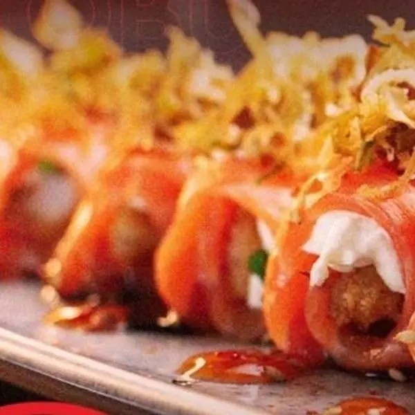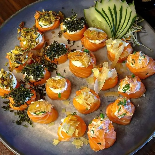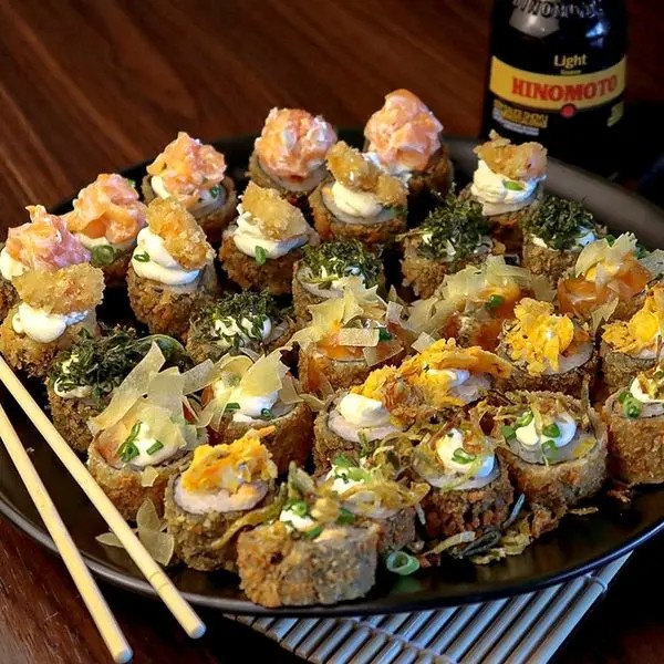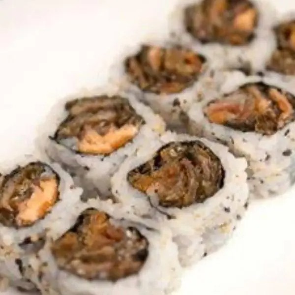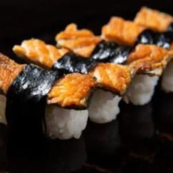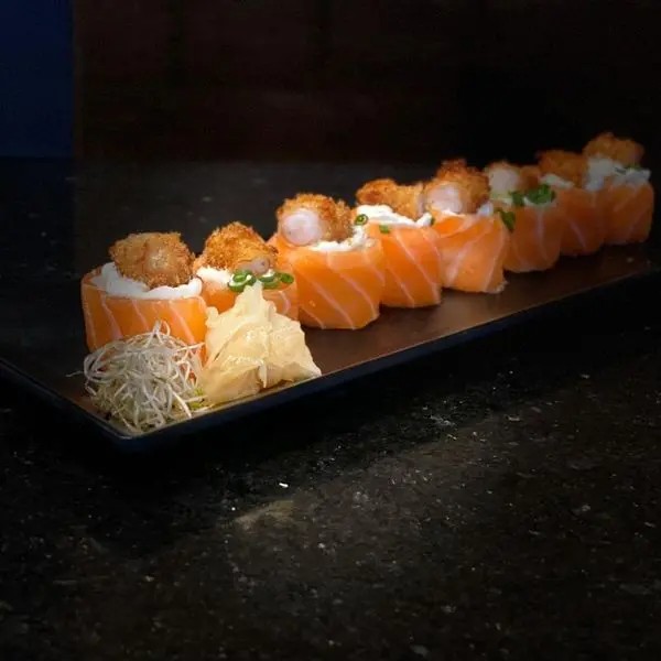 8 unidades- recheio de salmao cru, em cima salmao maçaricado, cream cheese, e raspas de limao siciliano. * Shoyu e tare em sache enviamos quantidade padrão.