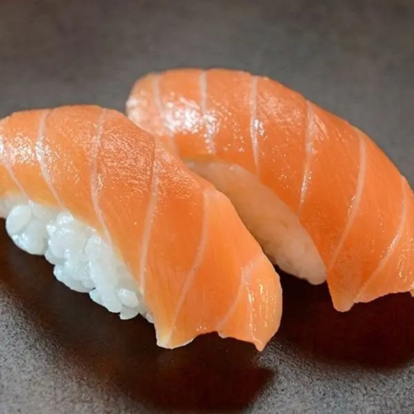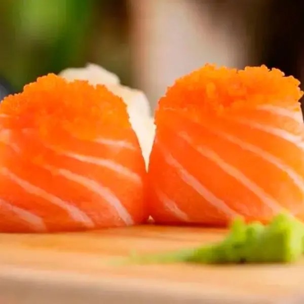 Arroz, com fatia de salmão em cima. Wasabi e gengibre enviamos quantidade padrão. * Shoyu e tare em sache enviamos quantidade padrão.
