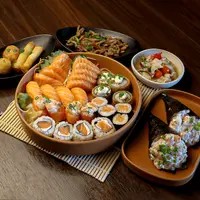 Combinado especial com 10 hot rolls crocantes, 10 hossomakis, (sendo 5 peças de kani,5 de salmão), 5 joes de salmão 5 joes de pepino e 10 uramakis. Uma seleção completa para quem busca variedade , frescor e muito sabor em um unico box.