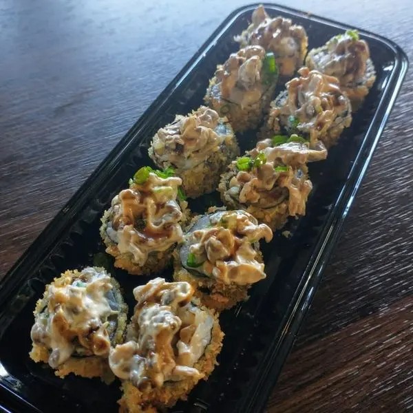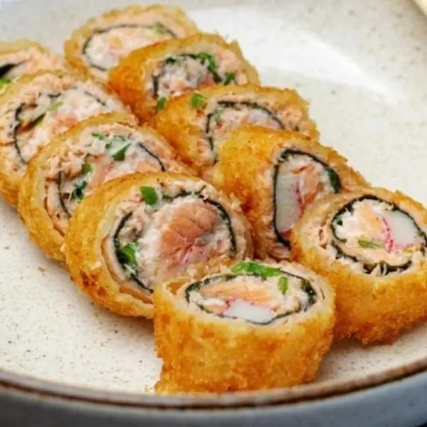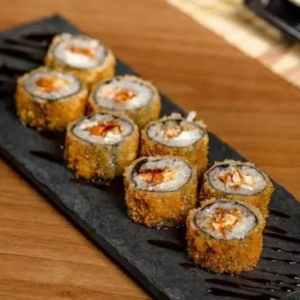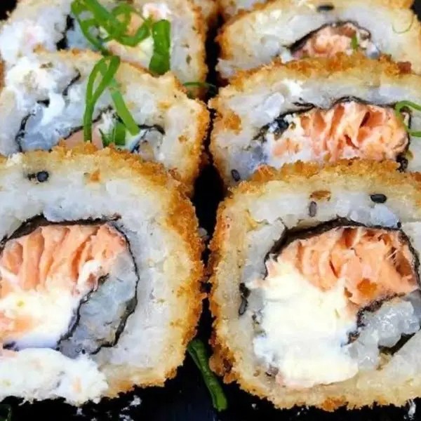 Enrolado de arroz com salmão grelhado,cream, e frito na panko.