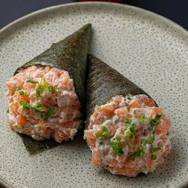 Salmão enrolado no arroz, com salmão e cream cheese em cima. Com opcional de couve, Doritos, geleia de pimenta ou alho poró. Wasabi e gengibre enviamos quantidade padrão. * Shoyu e tare em sache enviamos quantidade padrão.