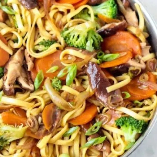 Macarrão oriental salteado com mix de legumes (,acelga,brocólis,couve-flor,cenoura), tiras de carne bovina e frango, temperado com nosso molho especial receita da casa. (Aproximadamente 500g)