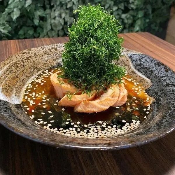 16 fatias De Sashimi De Salmão , Maçaricado Geleia De Pimenta E Couve Crispy