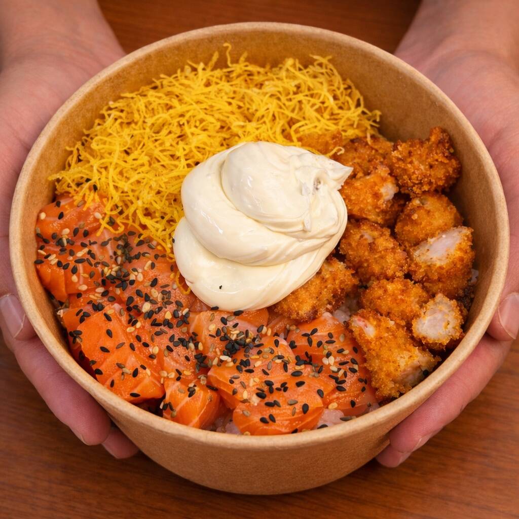 Base de arroz japonês soltinho, cubos de salmão fresco,camarão empanado, crispy de mandioquinha crocante e cream cheese cremoso, trazendo equilíbrio perfeito entre sabor e textura. ✨ Fresco • Equilibrado • Irresistível