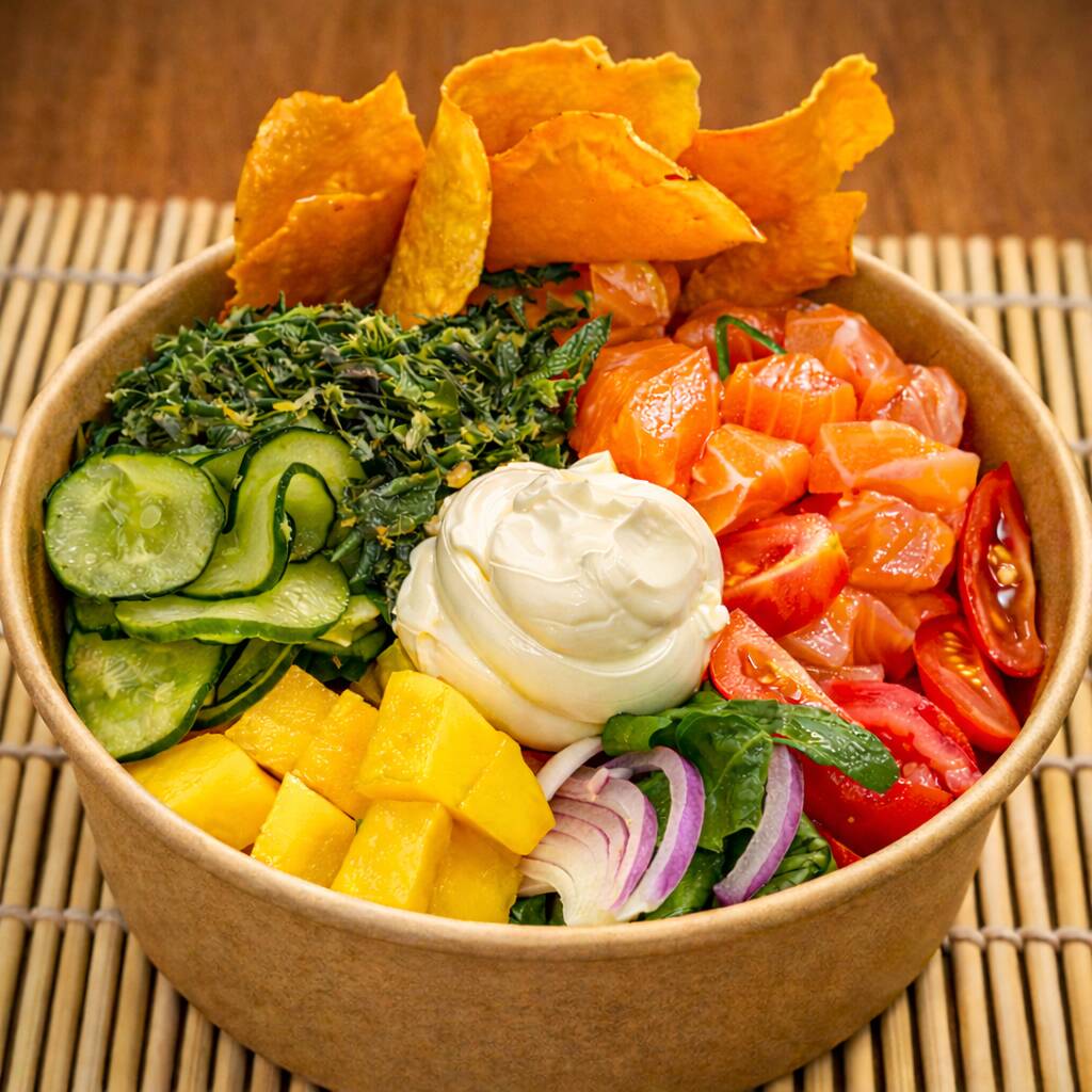 Poke de Salmão Premium base de arroz, Cubos generosos de salmão fresco, combinados com tomate cereja, rúcula, sunomono levemente agridoce, couve crispy crocante, manga fresca, cream cheese cremoso e cebola roxa para fechar o equilíbrio perfeito. Um poke leve, refrescante e cheio de sabor, com contraste de texturas e ingredientes selecionados, ideal para quem busca proteína de qualidade sem abrir mão do prazer. ✨ Fresco • Equilibrado • Irresistível