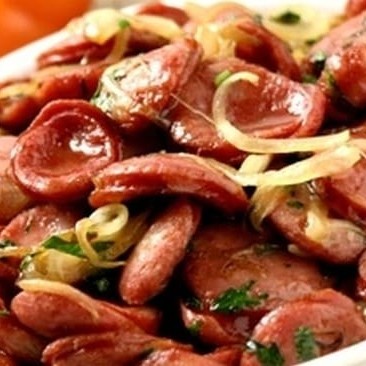 LINGUIÇA CALABREZA ACEBOLADA ,FRITAS, LEGUMES SORTIDOS ,ARROZ,FEIJÃO