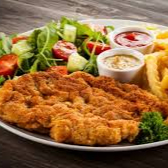 Filé de frango empanado e temperado com chimichuri, páprica etc... acompanhado de abobrinha refogada, batata frita ou purê de batata cremoso e Coca-Cola grátis para completar a refeição.