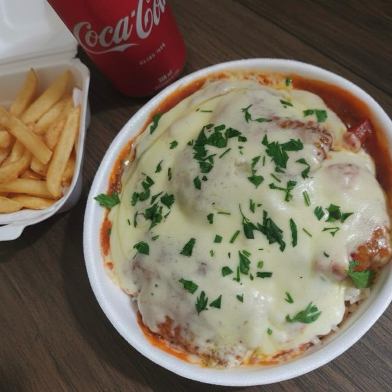 acompanha: arroz, feijão, 3 files a parmegiana + porção de batata CHIPS a parte.