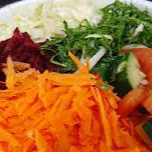 Salada de alface. Acompanhamentos (podem variar conforme disponibilidade do dia) : tomate, pepino, cebola branca ou roxa, cenoura ralada e beterraba ralada.