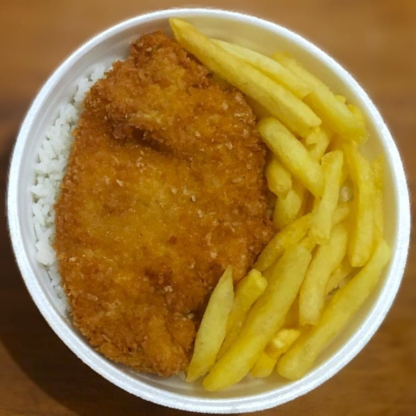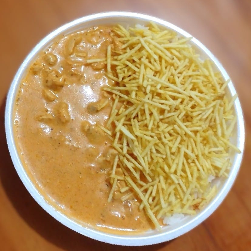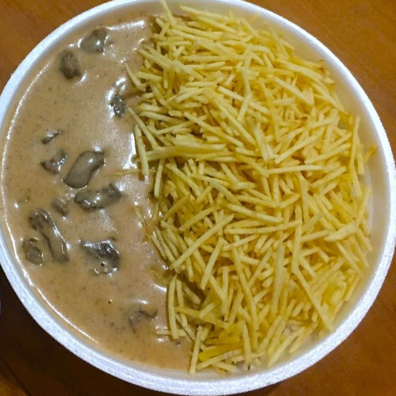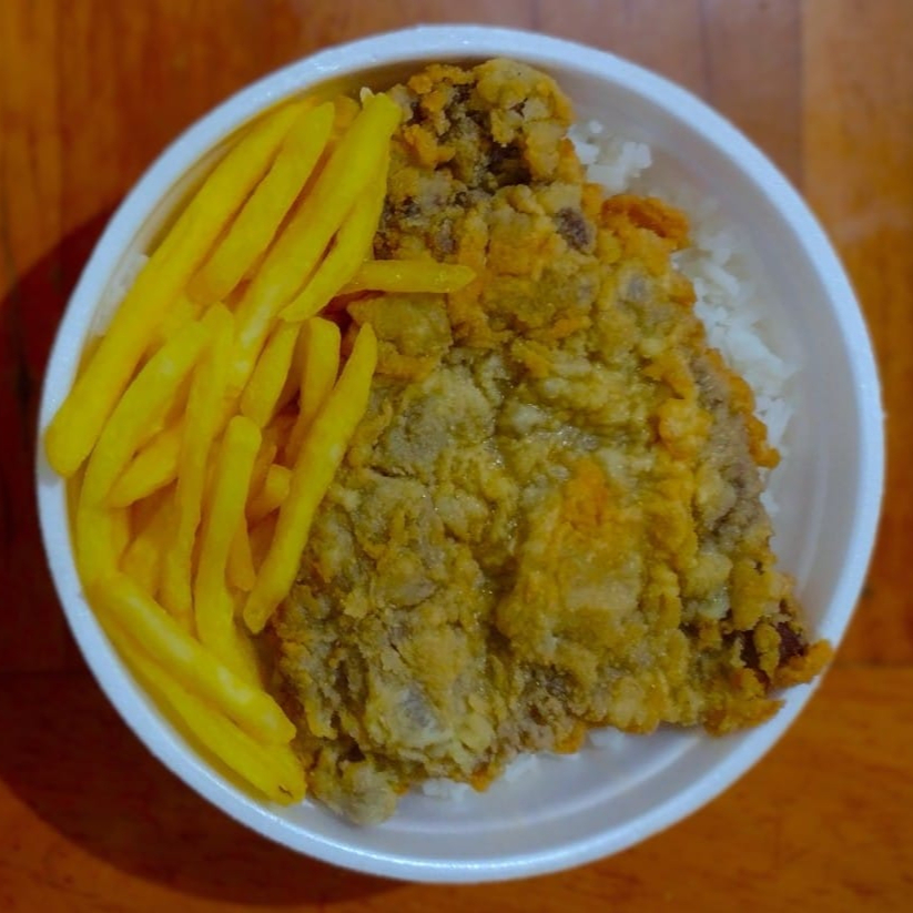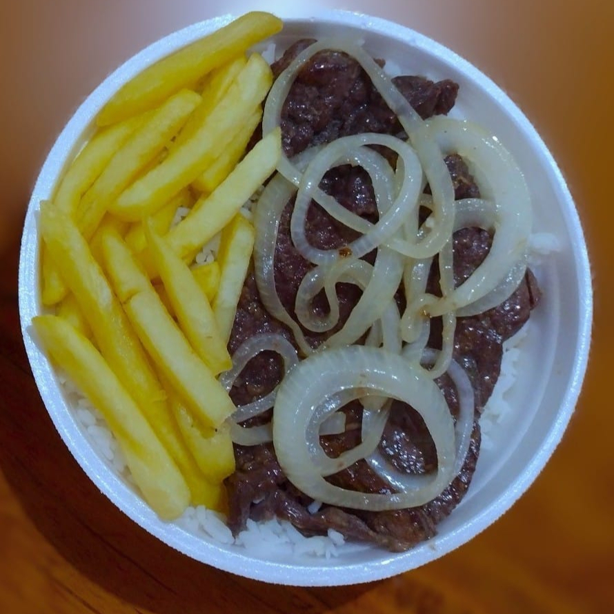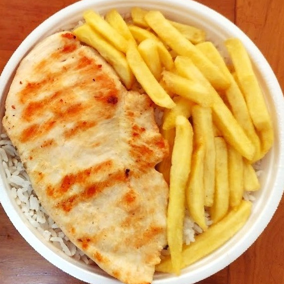 Arroz, (Feijão temperado com coentro fresco e calabresa) + Fritas.