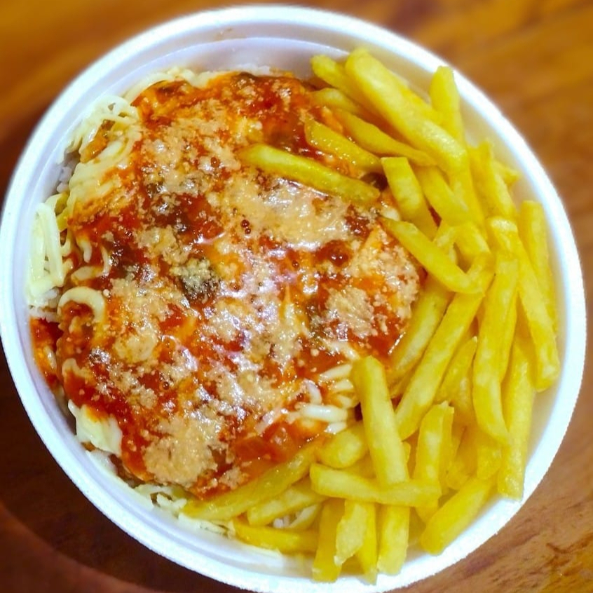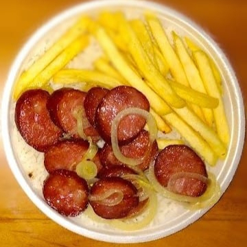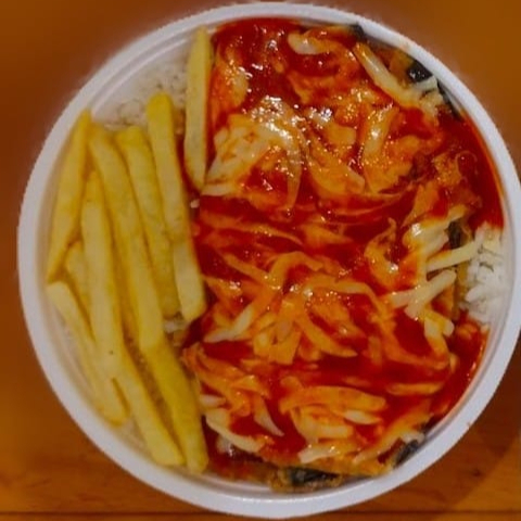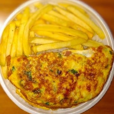 Arroz, (Feijão temperado com coentro fresco e calabresa), Omelete com mussarela tomate picado e calabresa +Fritas.