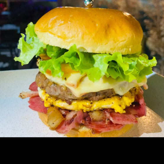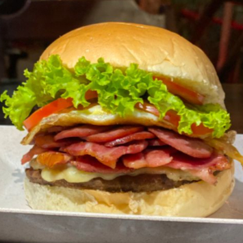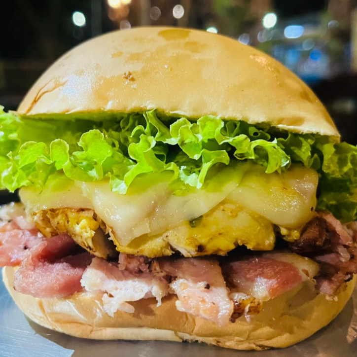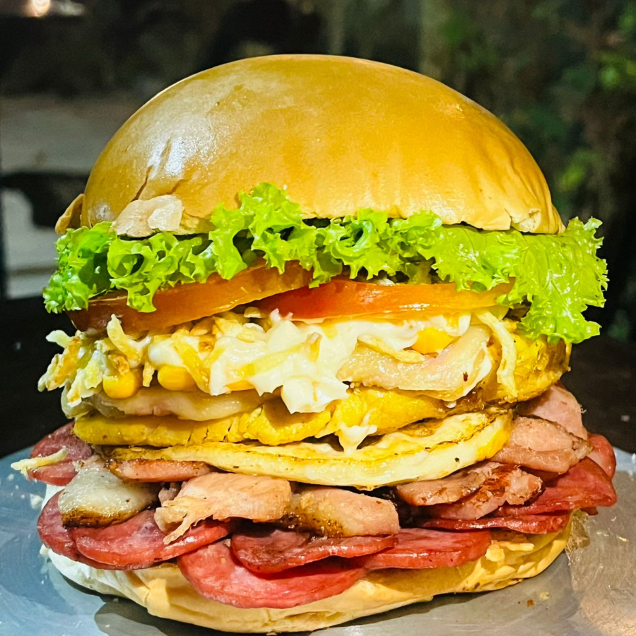 Pão Hambúrguer artesanal , presunto, queijo, bacob, calabresa, ovo, milho, catupiry, tomate , alface e batata palha
