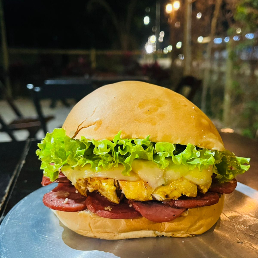 Pão Hambúrguer, presunto, queijo, bacon, calabresa, ovo, milho, catupiry, tomate e alface e batata palha