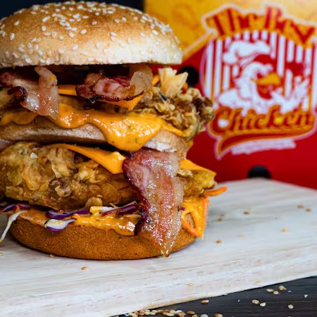 Sanduiche Com Molho Especial Tbc, Salada Mix, 2x Frango Crocante Empanado 120gr ( cada ) (1 em cada andar) 2x Queijo Cheddar (1 em cada andar ), 4x Bacon em Tiras No Pão Duplo Gergelim!