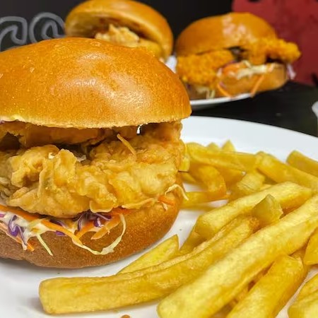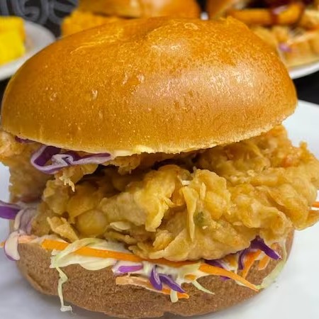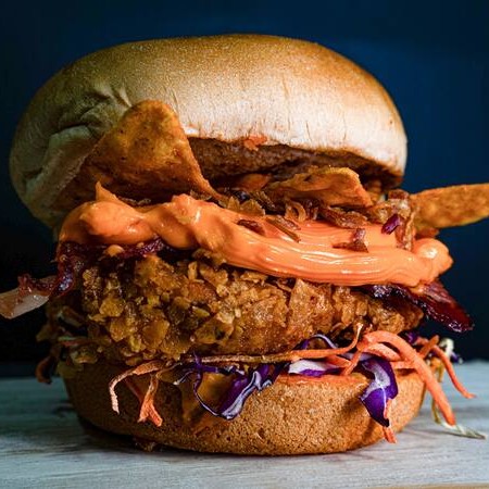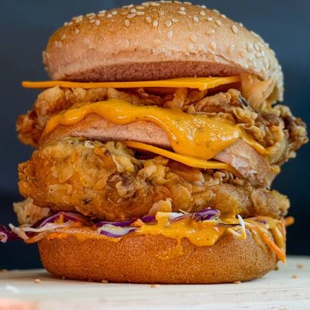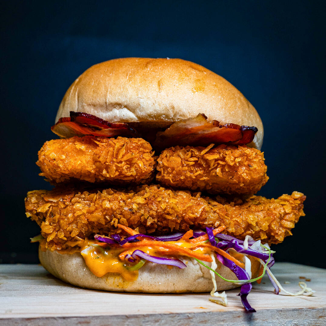 Sanduiche Com Molho Especial Tbc, Salada Mix, Frango Crocante Empanado No Doritos 120gr (Sassami), Bacon em Tiras, Catupiry Original, Cebola Crispy e Doritos Inteiro No Pão Brioche Ou Gergelim!