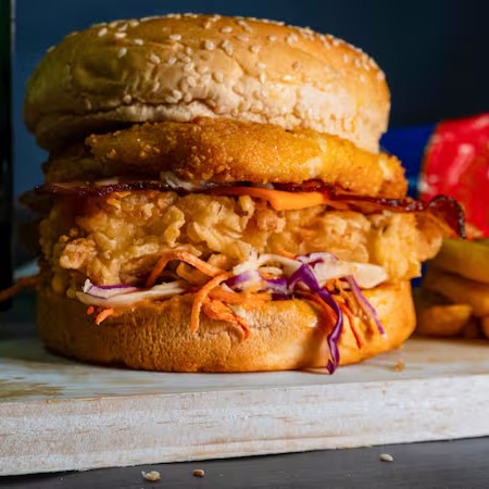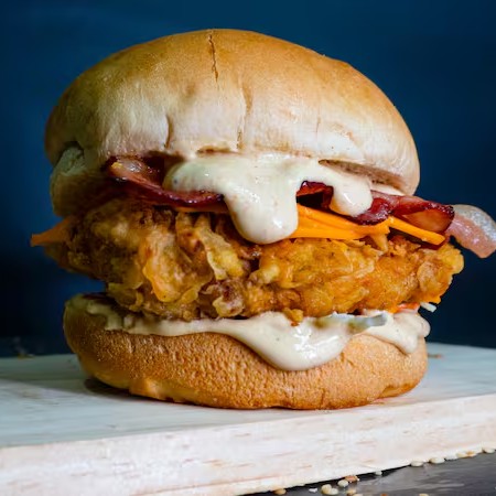 Sanduiche Com Molho Especial Tbc, Salada Mix, Frango Crocante Empanado 120gr (Sassami), Queijo Cheddar, Bacon em Tiras e Explosão Catupiry ( Catupiry Original Empanado) No Pão Brioche Ou Gergelim