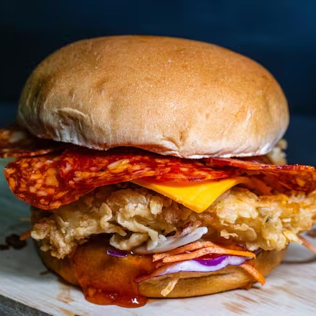 Sanduiche Com Molho Picante Tbc, Salada Mix, Frango Crocante Empanado 120gr (Sassami), Queijo Cheddar, Cebola Crispy e Muito Pepperoni (6fatias) e Geleia de Pimenta! No Pão Brioche Ou Gergelim