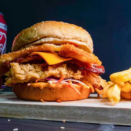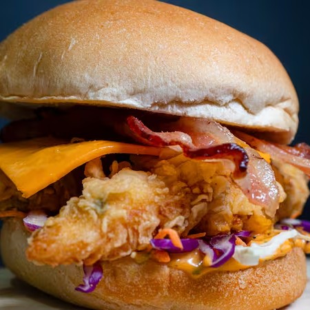 Sanduiche Com Molho Especial Tbc, Salada Mix, Frango Crocante Empanado 120gr (Sassami), Queijo Cheddar, Bacon em Tiras E Explosão de Mussarela (Queijo Mussarela Empanado) No Pão Brioche Ou Gergelim!