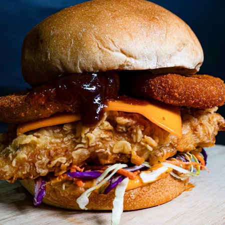 Sanduiche Com Molho Especial Tbc, Salada Mix, Frango Crocante Empanado 120gr (Sassami) Queijo Cheddar, Bacon Em Tiras e 2 Anéis de Cebola com Barbecue Opcional No Pão Brioche Ou Gergelim!