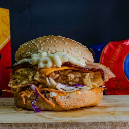 Sanduiche Com Molho Especial Tbc, Salada Mix, Frango Crocante Empanado no Doritos 120gr (Sassami), Bacon em Tiras, Cheddar Cremoso (bisnaga), Cebola Crsipy e Doritos Inteiro! No Pão Brioche Ou Gergelim