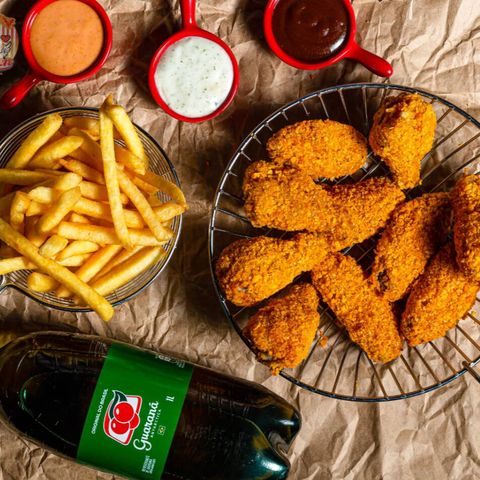 Ótima opção para dividir com alguém pagando menos. - 1 Balde Médio 500g (Corte a sua escolha) - 2 Molhos ( A sua escolha ) - 2 Batatas Pequenas - 1 Antartica 1 Lt Nas opções : Chiken Tradicional Chiken Doritos