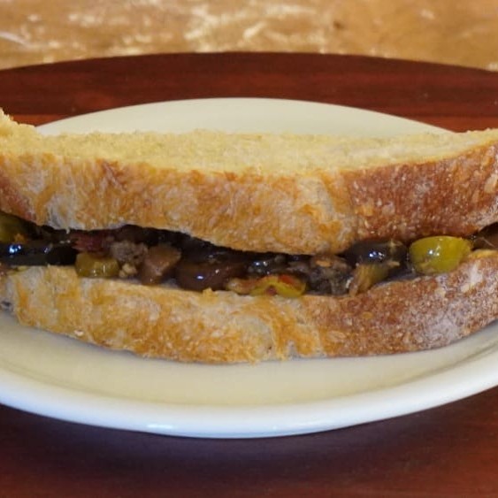 Duas fatias de Pão Italiano ou Integral de Longa Fermentação com antepasto composto por Berinjela, Abobrinha, Azeitonas, Nozes e Azeite. Nossos Pães são Veganos, Livres de Lactose e Livres de Açúcares Adicionados
