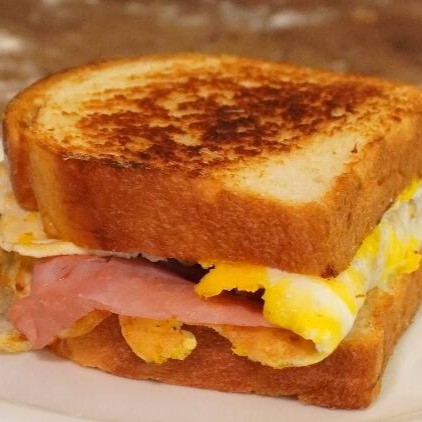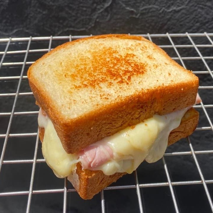 Pão de brioche com 50g presunto e 50g muçarela tostado na chapa.