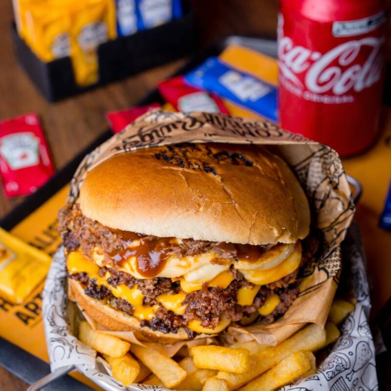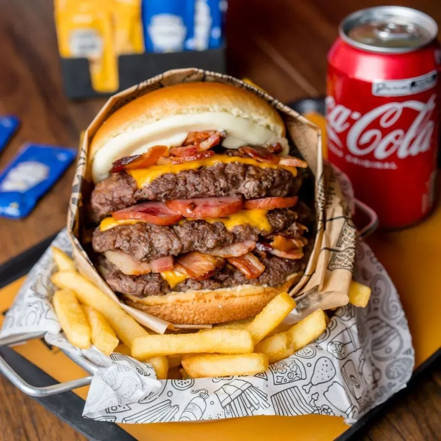 Esse Burguer Monstruoso Acompanha Nosso Pão De Brioche Selado, 3 Burgueres Suculentos Com Cheddar, Bacon Em Dobro, Catupiry E Calabresa. E Ai, Vai Encarar?