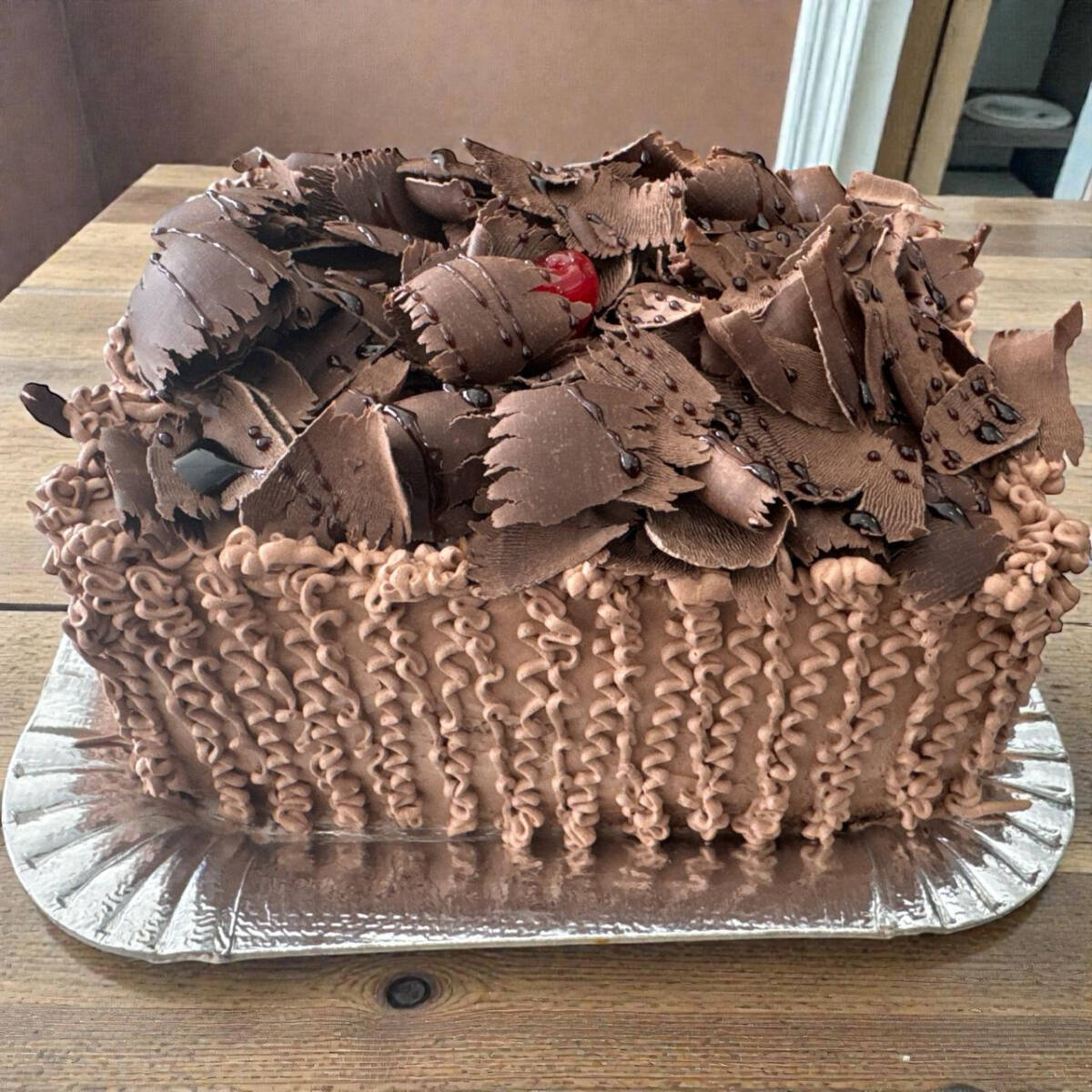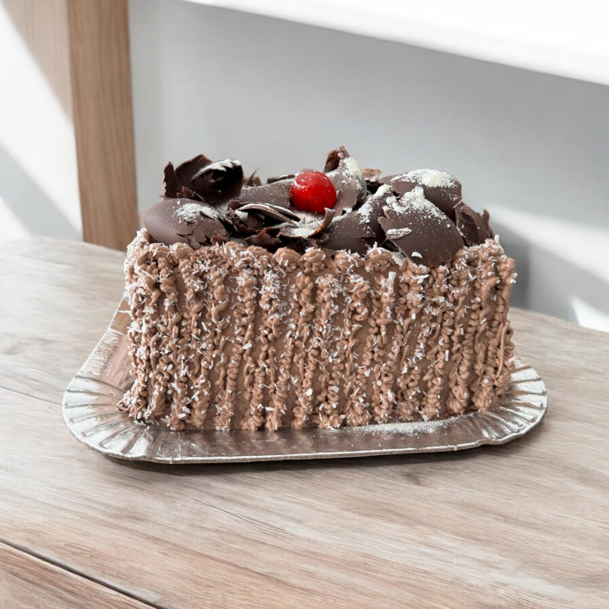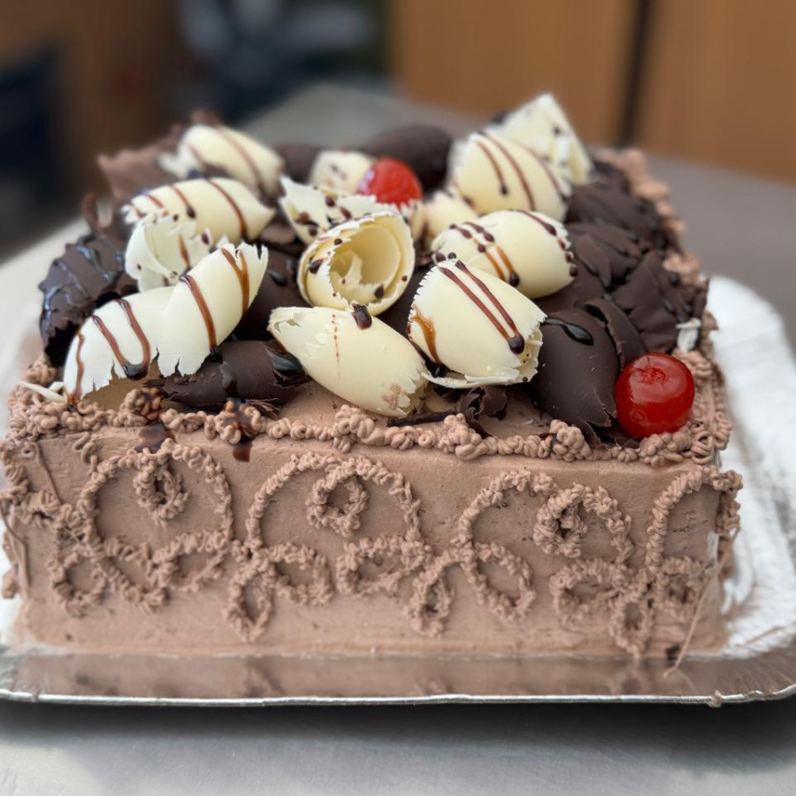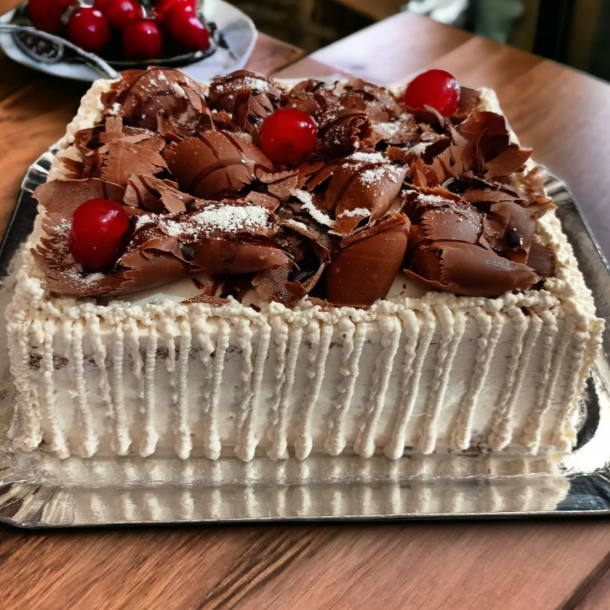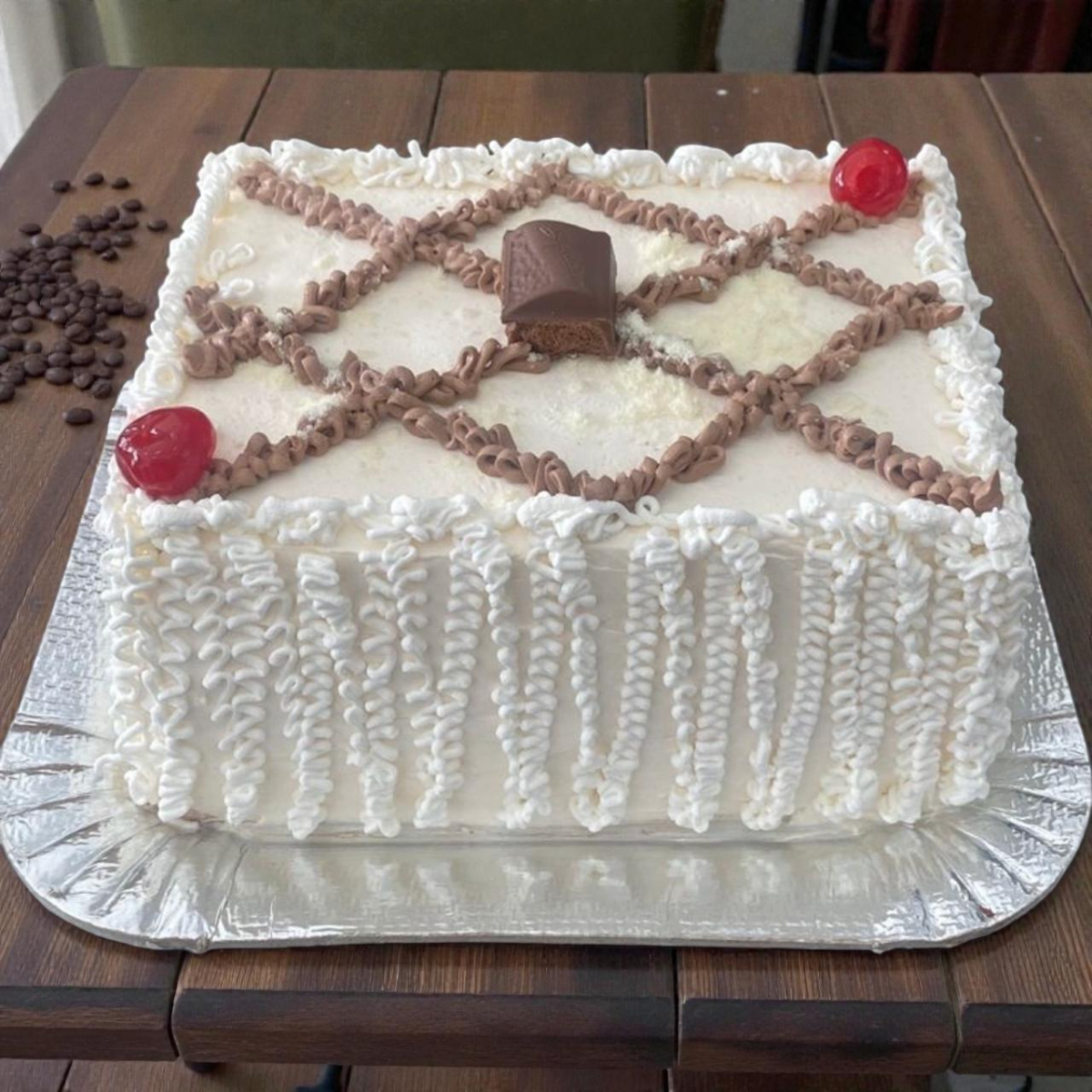 Trufado de chocolate preto e branco. Decoração raspas e cereja.
