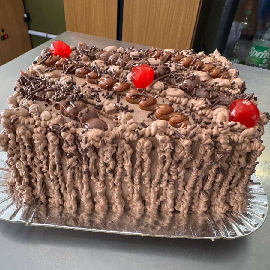 mousse de leite em pó nas duas camadas. Decoração raspas brancas cereja e leite em pó