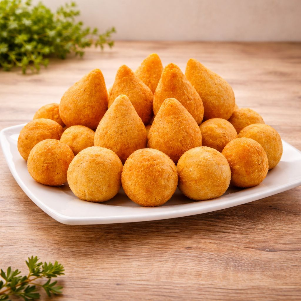 Coxinha, bolinha de queijo, calabresa, presunto e queijo , croquete .